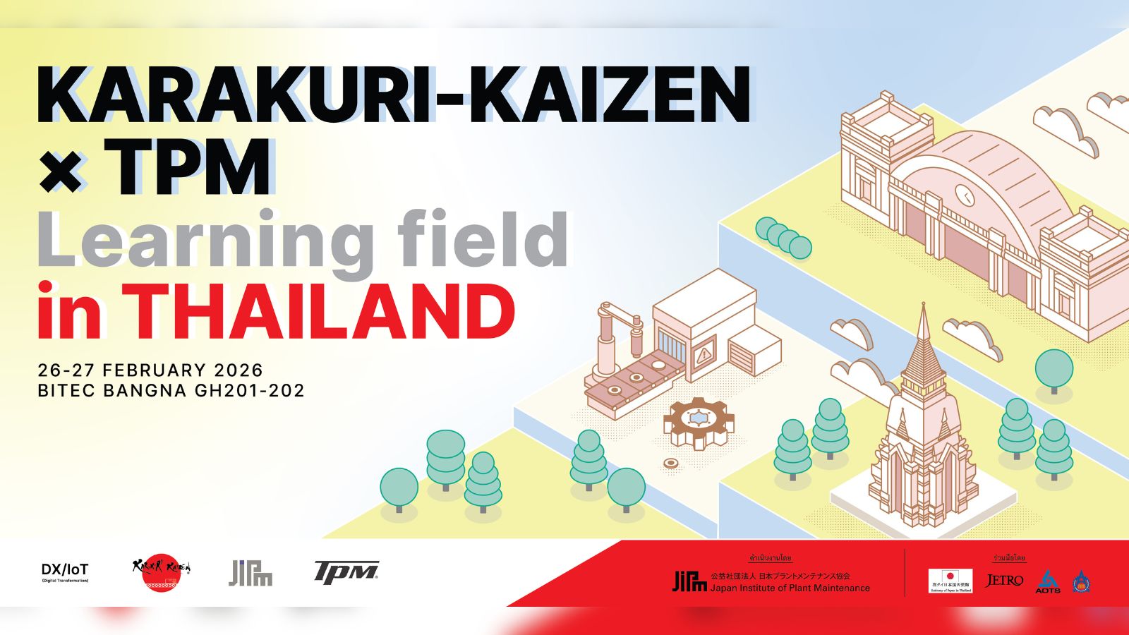 KARAKURI-KAIZEN × TPM LEARNING FIELD in THAILAND is an industrial learning exhibition focusing on production process improvement through the Japanese concept of Karakuri Kaizen. This approach emphasizes simple mechanical systems, low investment, no electrical control, and workplace safety.